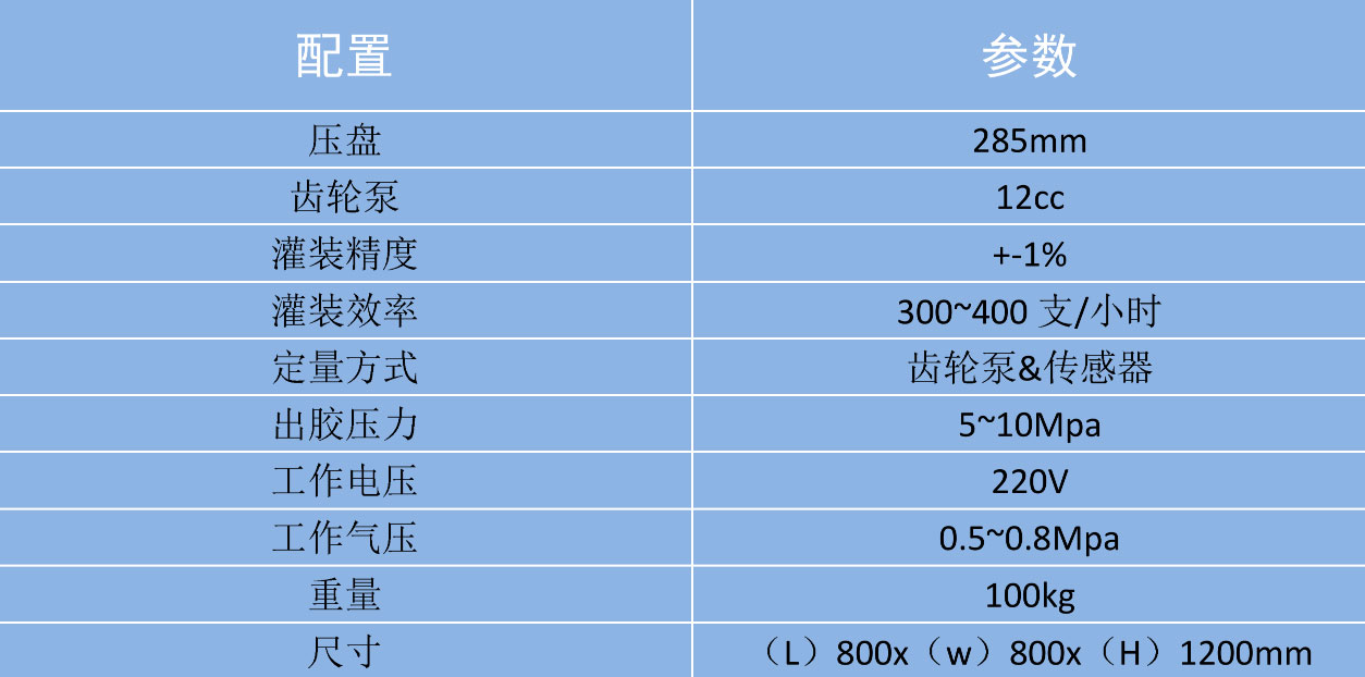 该机型主要由压盘,齿轮泵,伺服电机等主要部件组成,压盘在气缸的带动下压入胶桶,胶水在压盘的压力下进入齿轮泵,伺服电机带动齿轮泵每旋转一圈便可挤出一定量的胶水。伺服电机强大的扭力可以将胶水增压至 10Mpa,从而将超高粘度胶水挤出,即使无流动性的胶水,压盘也能将其压入齿轮泵。使胶水通过出胶阀进入针管。