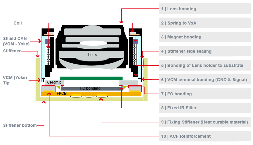 应用点: 1)滤光片支架和滤光片固定 2)基材:IR glass, PC, PPA , LCP etc