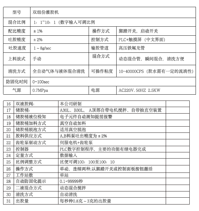 1、储料系统: A/B 30L/30L不锈钢料筒。(30L料桶方便抽真空,桶小会将胶水抽出)